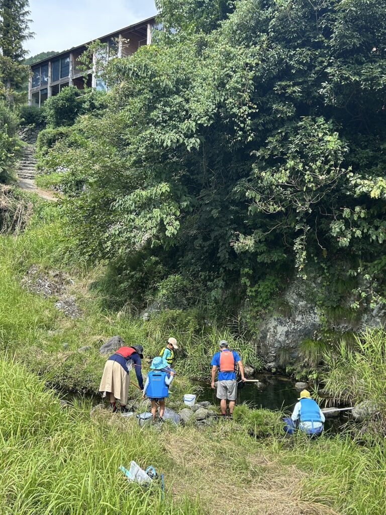 今回のフィールドはWEEK神山の前を流れている川で行いました。水深は大人の腰まであります。岩影や水草、葦の根元を中心に皆さん真剣にいきものを捕まえていました。