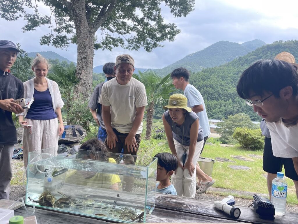 こちらは、緩やかな流れのある溜まりのような環境です。イシガメの赤ちゃんやアカハライモリ、ミズカマキリなど流れの速い本流では見つからない種類を見ることができます。約1時間で皆さんが捕まえたいきものを母屋の縁側まで持ってきてもらい観察をしました。約15種類の川のいきものを捕まえることができ、その中でも、川と海を行き来する大きなヒラテテナガエビが注目を集めていました。