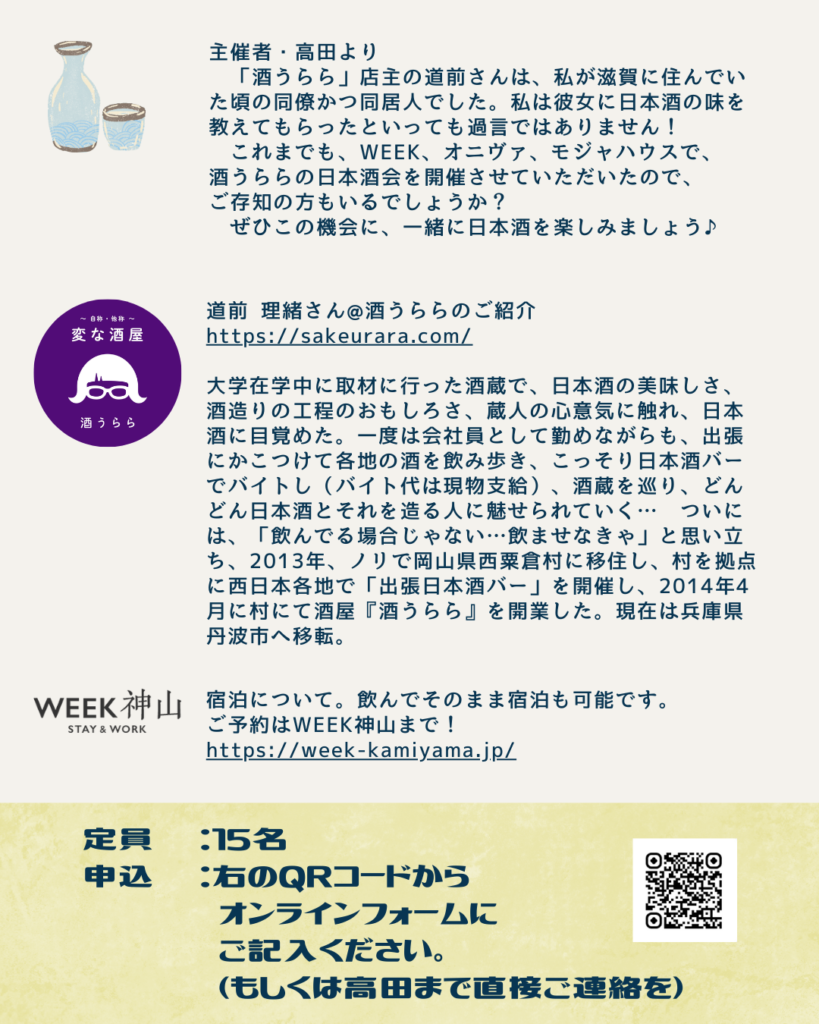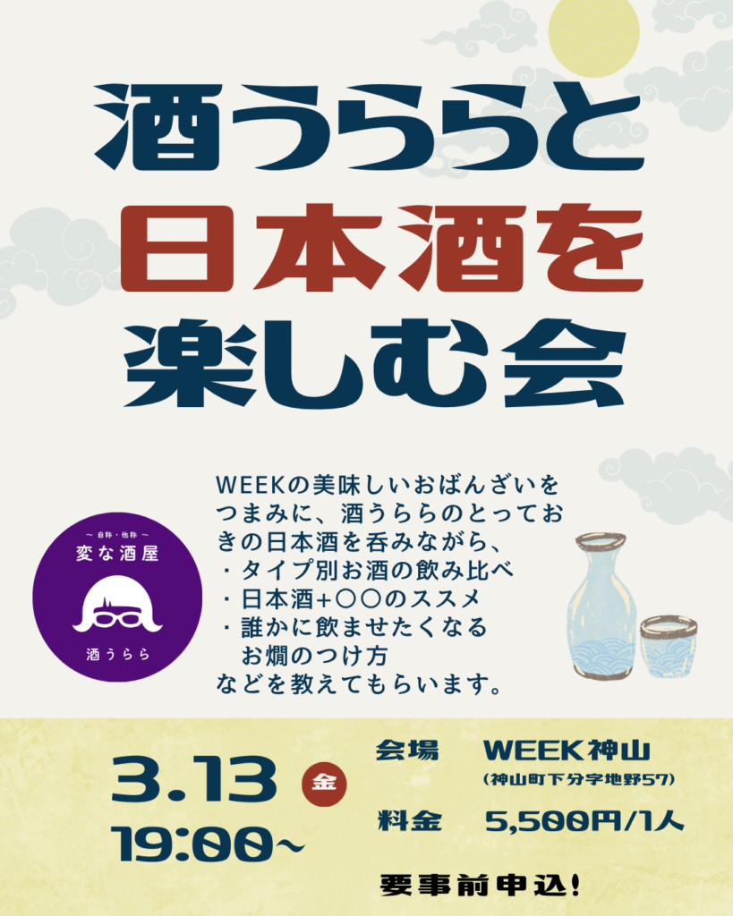 3月13日につなぐ公社の高田さんの友人、酒うららさんの日本酒イベントを開催します。 全国津々浦々のおいしい日本酒を飲める楽しい時間になると思います。