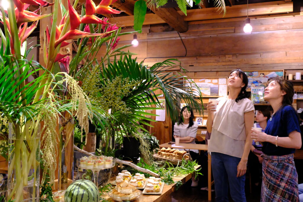 スイーツビュッフェと植物の空間レイアウトのイベント『スイーツnight』。今回は夏がテーマだったので、ジャングルをイメージした空間演出をしてもらいました。大きな植物とトロピカルなフルーツを使ったスイーツととても非日常な時間になりました。(少しやり切った感があり、次回に向けたキーワード探しが今続いてます)