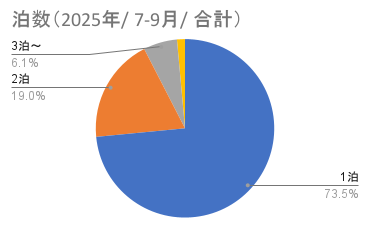 年間でも7月や8月は観光シーズンとなるため、泊数にどういった影響があるか見ていましたが、結果は微増ほどで数値に大きな変化はありませんでした。他の時期と比べ、変化が見えた部分としましては、連泊ゲストの内訳が少し異なっておりました。年間を通して1名利用の連泊が一定数あるのですが、今回の3カ月では、小さい子連れのファミリー層、また企業としての視察団体にも増加傾向が見られました。8月はレジャー層が中心となりますが、同施設に連泊ではなく、町内で1泊毎に宿泊施設を変えていくという方もいらっしゃいました。サウナ付き、温泉付きと町内の宿泊施設にも種類があるので、そこをユーザーが調べて独自で滞在方法を決めていたのが新たな気付きとなりました。