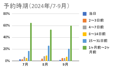 昨年比較し、さらにリードタイムが長くなり、早い段階で予約を確定してくれる方が増加しております。仕事や視察は比較的早くに予定が決まっていく傾向ですが、7月から9月のレジャー層でも、今回は早くに予約をしてくれており、WEEKへの目的意識を見ることができ、非常にありがたく思います。但し、見方を変えれば、選択肢の少なさから早くにおさえないと予約が取れないというイメージもでてきており、実際タイミングが重なり、お断りすることも何度か発生しました。神山町での観光コンテンツは、意外に年間を通して見えたり、体験したりできるものも多いので、少し分散を促すことで、いくつかある夏の繁忙期課題解消を狙っています。