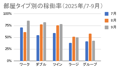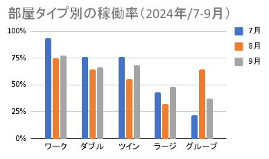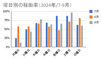 全稼働で見た際に、7月は昨年より13%減少、8月は6%増加、9月は10%増加という結果になっております。増加の部分に関しましては、曜日問わず、満遍なく増えております。減少の部分のところで7月に着目して見ますと、金曜日以外の平日、そして日曜日の稼働がほぼ横一列で同じような数値になっており、分析が難しいところです。よくある傾向としまして、全体的に弱い平日でも、さらに強弱がついてくるのですが、WEEKに関しましては、どの曜日も変わらないというところで、今のターゲットとしましては天井が近づいているのかなと捉えることが出来ます。他エリアの同規模施設では、民泊とマンスリーのハイブリッド運営で年間計画を立てるなど工夫もしている中で、WEEKとしましても価格変動がない分、ウィークリーやマンスリー提案、ほかに日帰りデイユース提案など、宿泊方法の種類と幅をくっきり分かりやすく表現した方が良いのかなとも個人的には思いました。